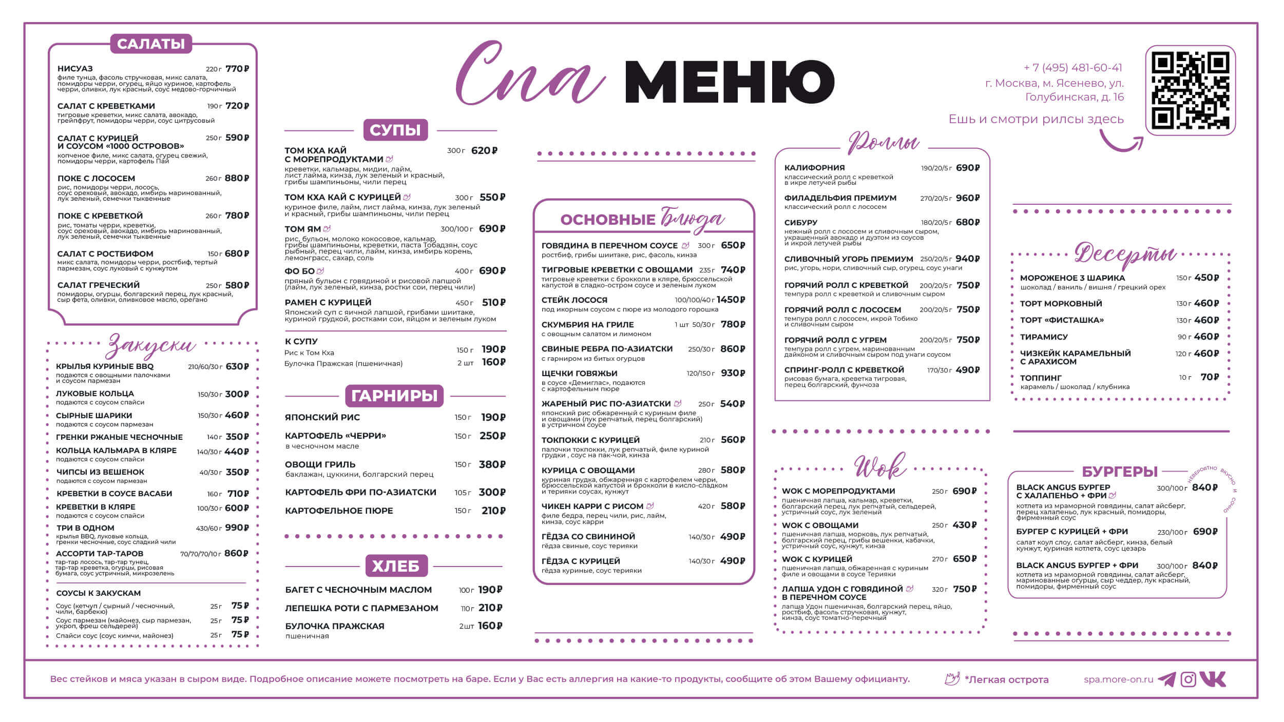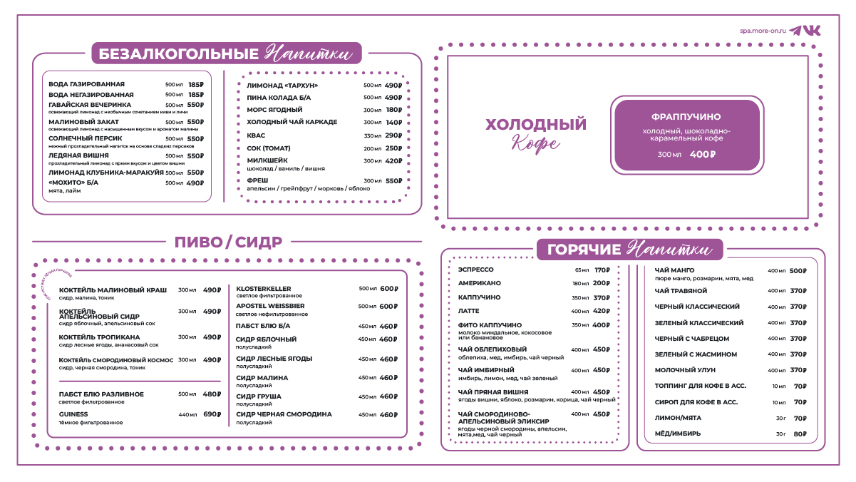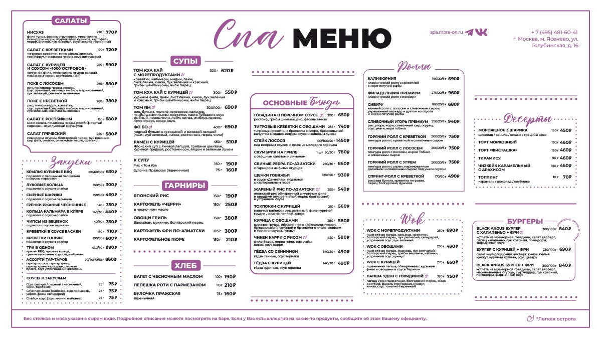 Попробуйте оригинальные салаты, изысканные горячие блюда, аппетитные супчики, легкие закуски и нежнейшие десерты. А после сеансов восстановите водный баланс травяным чаем и свежевыжатыми соками.